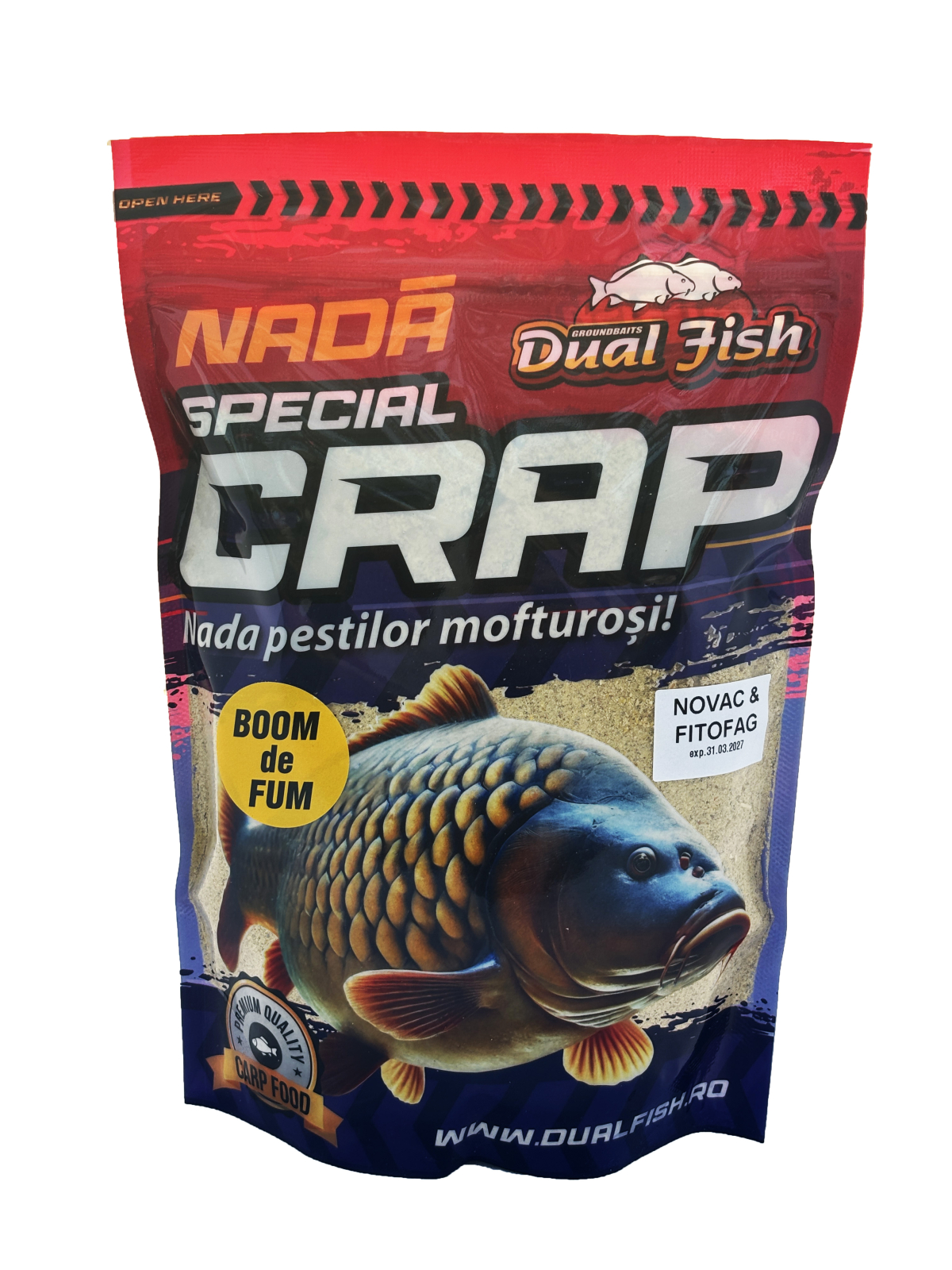 Nada BOOM DE FUM Special Crap are o granulatie grunjoasa si contine un mix de peleti, fiind folosita in pescuitul crapului. Ceea ce o face cu totul speciala este faptul ca este fumigena, oferind un BOOM DE FUM la fiecare partida. Se aplica direct pe momitor sau se formeaza bulgari.